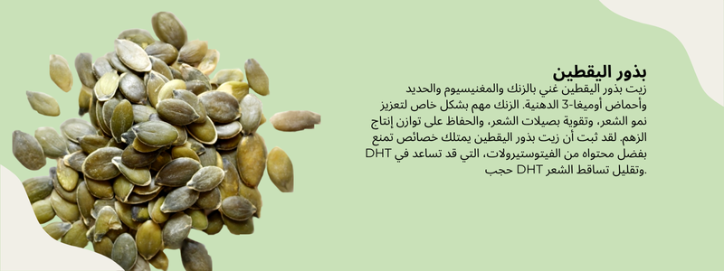 - يحتوي زيت بذور الكتان وزيت بذور اليقطين على مستويات عالية من الحديد والمغنيسيوم، وكلاهما ضروري لتحسين الدورة الدموية في فروة الرأس وتزويد جذور الشعر بالأكسجين والعناصر الغذائية اللازمة لنمو قوي وصحي. كما يُعد زيت بذور اليقطين مانعًا طبيعيًا لهرمون DHT، مما يعني أنه يمكن أن يساعد في تقليل آثار هرمون DHT (ديهدروتستوستيرون)، وهو هرمون مرتبط بتساقط الشعر، وخاصةً في حالات الصلع الوراثي. من خلال تثبيطه لهرمون DHT، يساعد زيت بذور اليقطين على إبطاء تساقط الشعر وتهيئة بيئة أكثر ملاءمة لنموه.